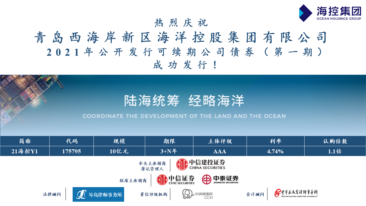 4月20日,??丶瘓F(tuán)成功發(fā)行新區(qū)首筆公募可續(xù)期公司債券“21海控Y1”,發(fā)行規(guī)模為10億元,票面利率4.74%,期限為3+N年期。該筆可續(xù)期公司債券是西海岸新區(qū)國有企業(yè)首筆公募可續(xù)期公司債券。