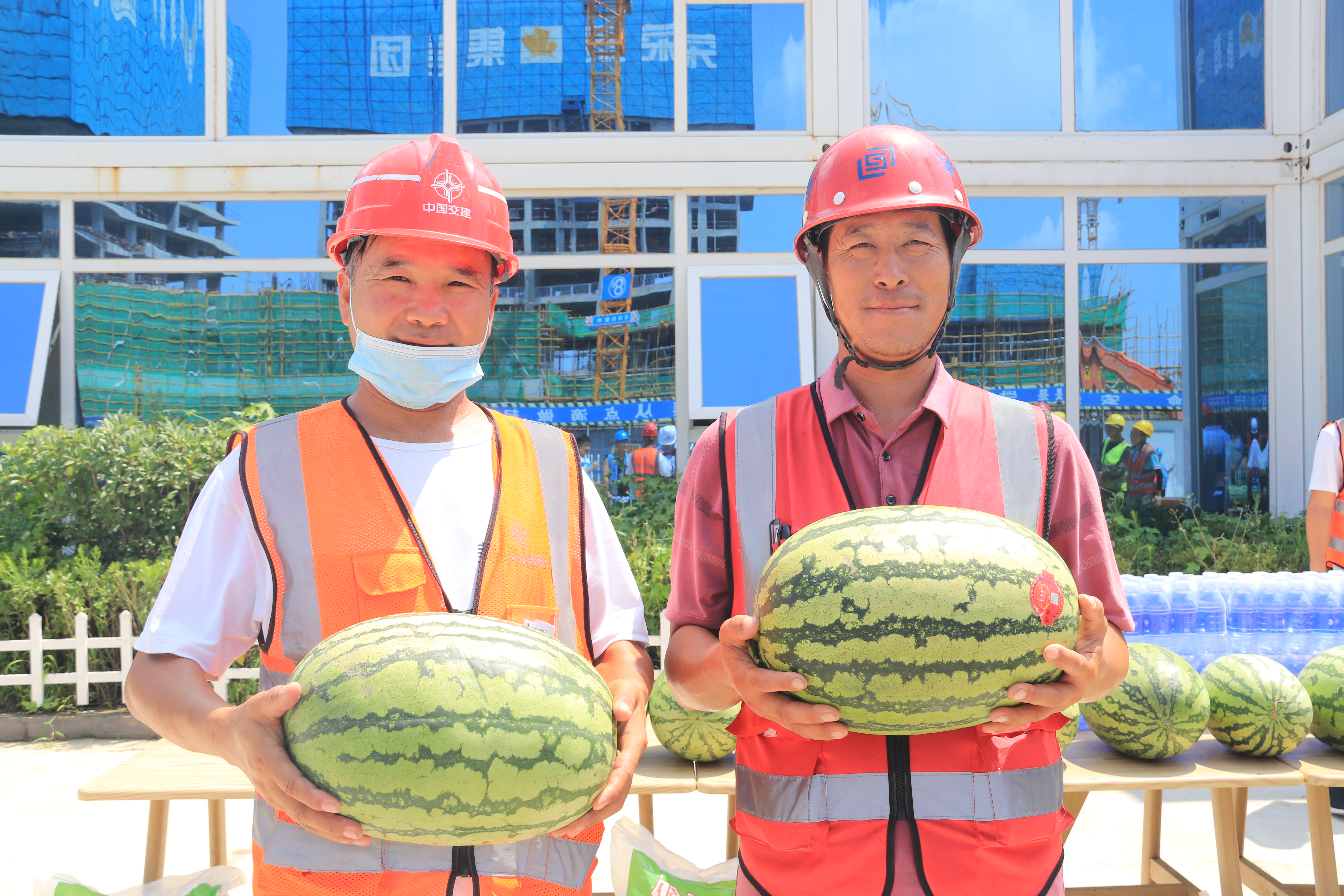 在炎炎烈日下,工人們?nèi)悦爸崾钚燎诘膭趧樱袟l不紊的推動項目建設。海控集團創(chuàng)投公司協(xié)同黨建與綜合部為現(xiàn)場工人送上綠豆、礦泉水、西瓜等防暑物資,并叮囑大家合理安排作息時間、創(chuàng)造良好的工作環(huán)境,切實做好防暑降溫,確保生產(chǎn)作業(yè)安全、健康、高效。