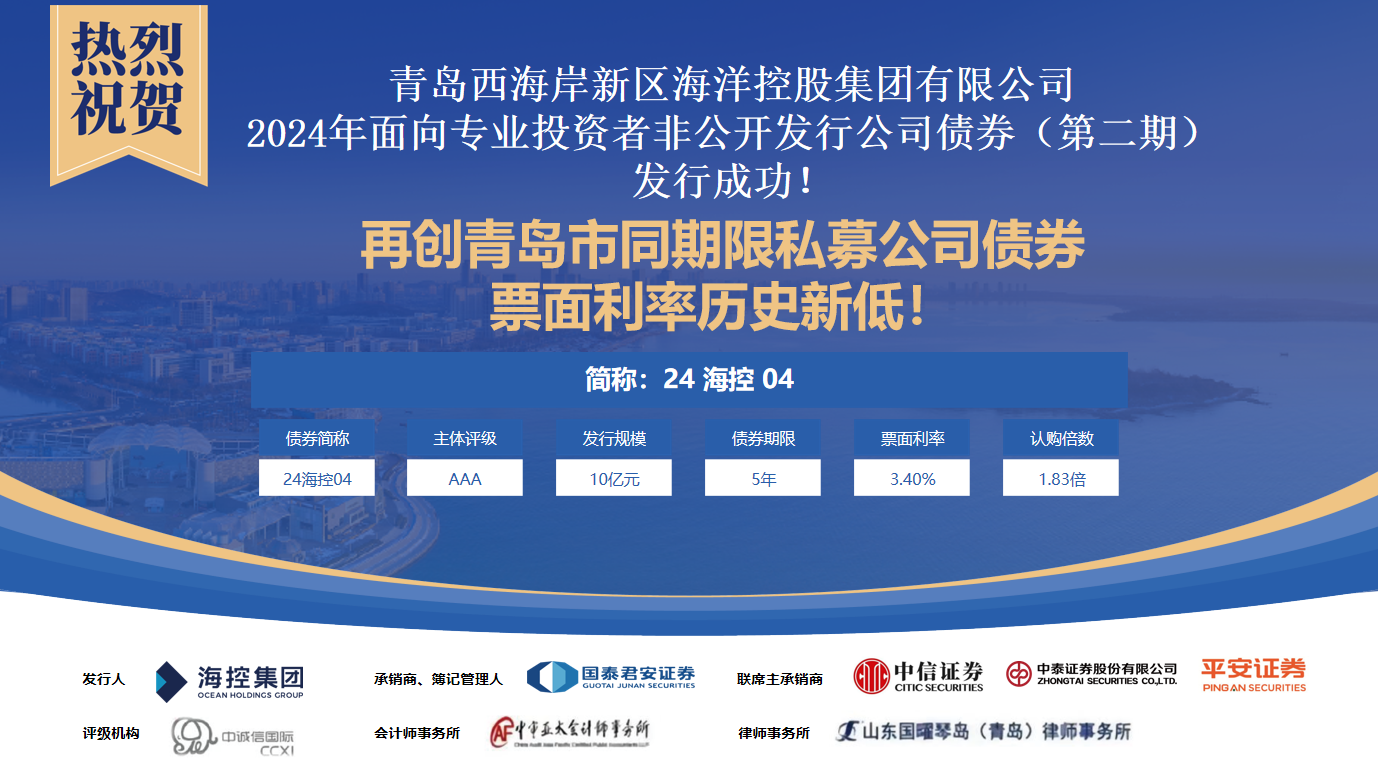 4月9日,海控集團成功發行2024年面向專業投資者非公開發行公司債券(第二期),票面利率再創青島市同期限私募公司債券歷史新低。
