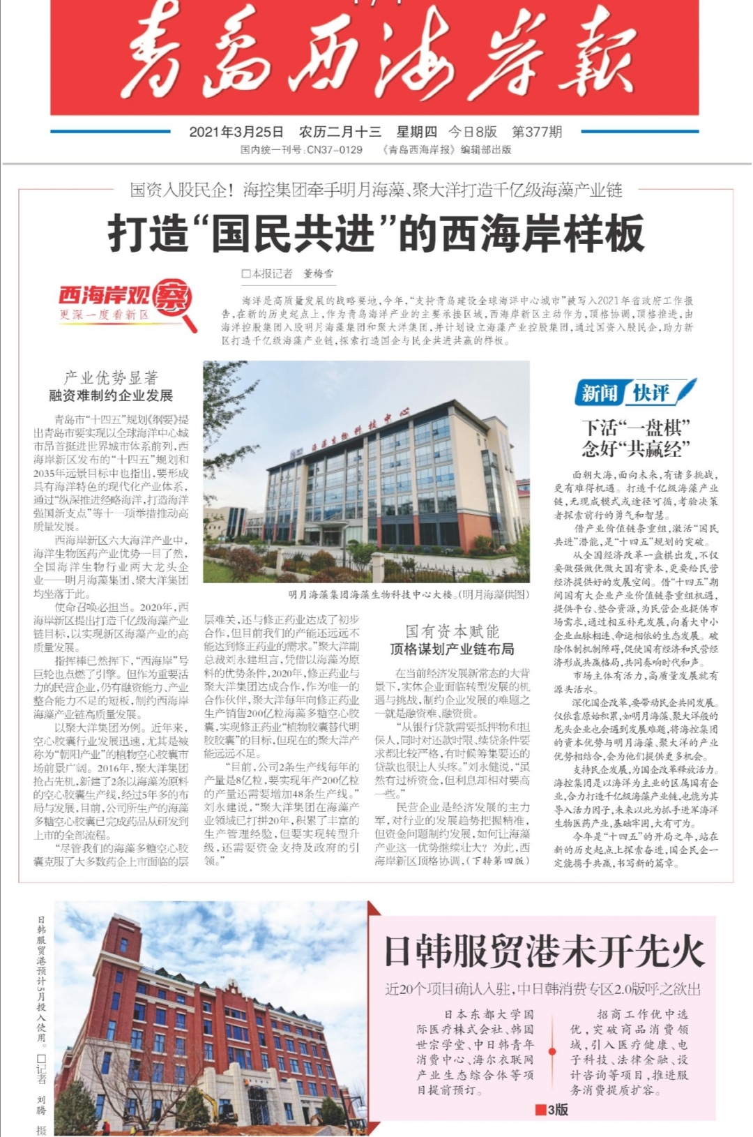 海洋是高質(zhì)量發(fā)展的戰(zhàn)略要地,今年,“支持青島建設全球海洋中心城市”被寫入2021年省政府工作報告,在新的歷史起點上,作為青島海洋產(chǎn)業(yè)的主要承接區(qū)域,西海岸新區(qū)主動作為,頂格協(xié)調(diào),頂格推進,由海洋控股集團入股明月海藻集團和聚大洋集團,并計劃設立海藻產(chǎn)業(yè)控股集團,通過國資入股民企,助力新區(qū)打造千億級海藻產(chǎn)業(yè)鏈,探索打造國企與民企共進共贏的樣板。
