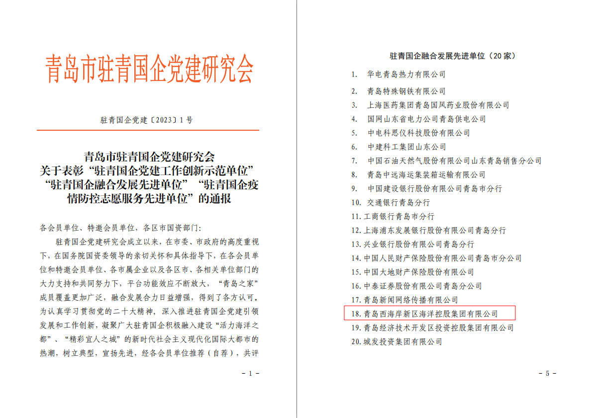 要聞信息 | 海控集團榮獲“駐青國企融合發展先進單位”稱號